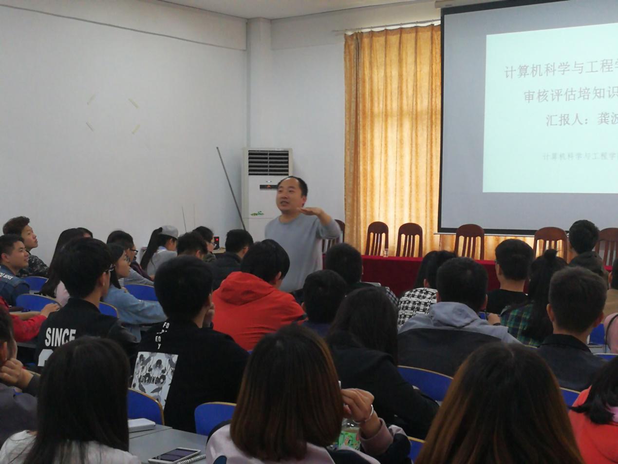 4月14日中午,我院于逸夫楼108室举行本科审核评估知识讲座,讲座由副院长龚波老师主持,我院全体主要学生干部与会。会上,龚波老师从“6+1项目、24要素、64要点”三个层次讲解了本科评估的审核范围,并详细阐述了本科教学评估与我院师生的关系。他强调,评估的目的是为了明确学校的人才培养目标,保障和提高人才的培养质量,培养高级专业人才、合格的建设者和可靠的接班人,最终评估的受益人归根结底还是学生本身。随后,他通过解读我校校训,鼓励同学们埋头实干、敢于创新、以诚相待,全力以赴。面对专家走访,要大方、客观地反映我院在本科人才培养方面的新举措与取得的效果。