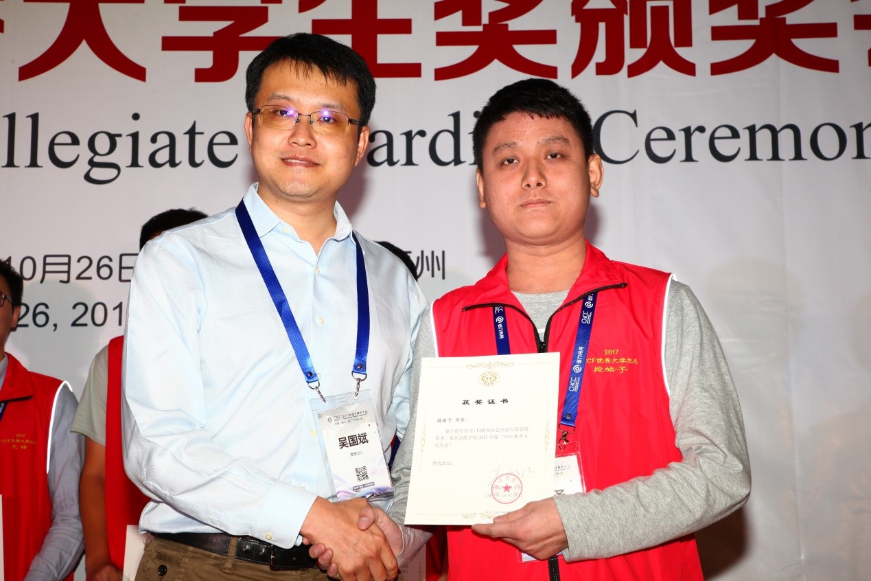 CCF优秀大学生奖为倡导大学生积极进取、求知求真,激励优秀而设,从2012年起每年评选一次。六年来已经有600多位在计算机(或相关)专业就读的同学获得了此项殊荣。CCF从2017年6月7日起,开始接受2017年度“CCF优秀大学生奖”的推荐。评审期间, “CCF优秀大学生奖”评审工作组对推荐材料进行了严格审核,对有异议的被推荐人采取少数服从多数的评审原则,最终确定共有104名来自中国科学院大学、清华大学、国防科学技术大学、浙江大学、北京大学、南京大学、东北大学、吉林大学、西安电子科技大学、武汉大学、北京邮电大学、中国科学技术大学、湖南科技大学等全国五十余所高校的学生获得2017年度“CCF优秀大学生奖”。