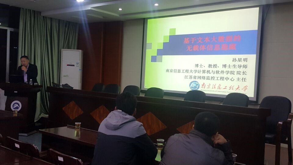 2017年11月27日晚上8点,南京信息工程大学计算机与软件学院院长孙星明教授应邀在逸夫楼201报告厅做了题为“基于文本大数据的无载体信息隐藏”的学术报告。计算机科学与工程学院老师和部分研究生、本科生参加了此次报告会,讲座由院长刘建勋主持。