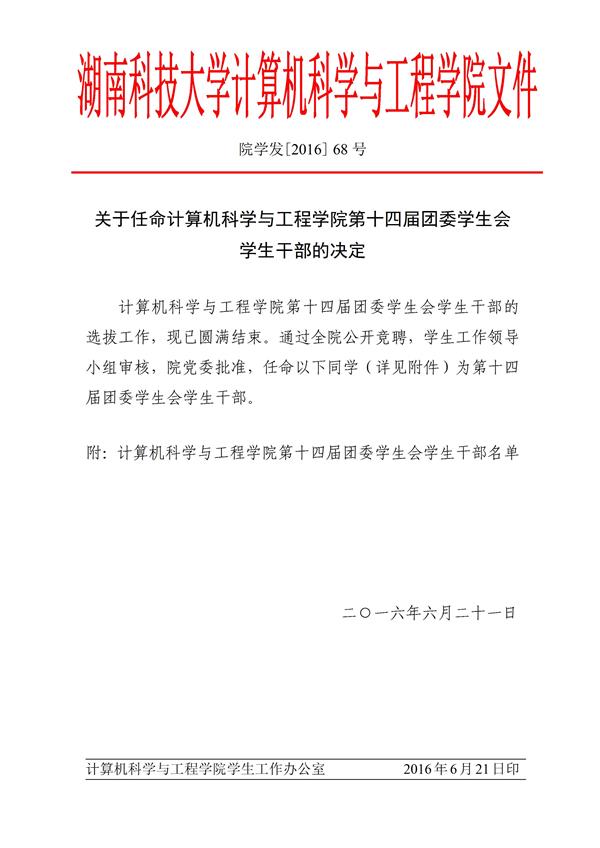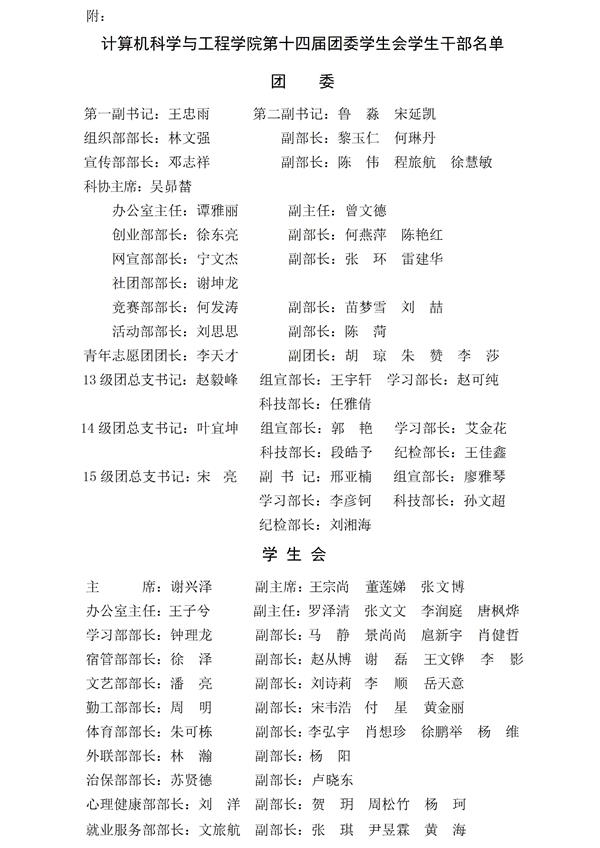 关于任命计算机科学与工程学院第十四届团委学生会学生干部的决定