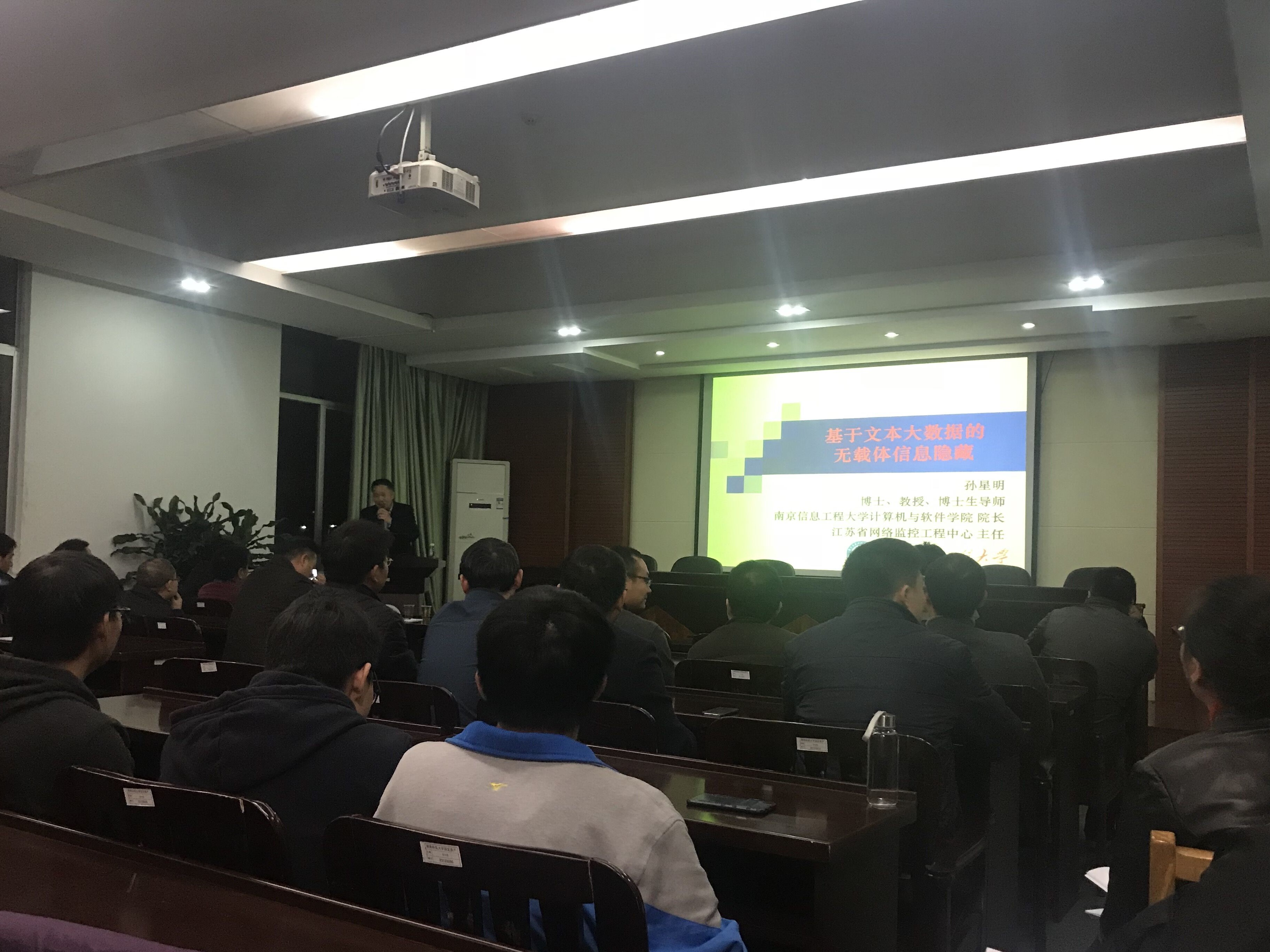 11月27日晚上8点,南京信息工程大学计算机与软件学院院长孙星明教授应邀在逸夫楼201报告厅做了题为“基于文本大数据的无载体信息隐藏”的学术报告。计算机科学与工程学院老师和部分研究生、本科生参加了此次报告会,讲座由院长刘建勋主持。