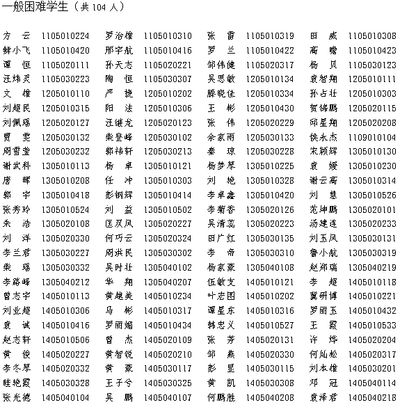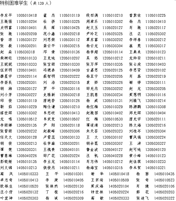 经各班级推举,学院初步评选,现将2014-2015学年度贫困生名单公示如下,