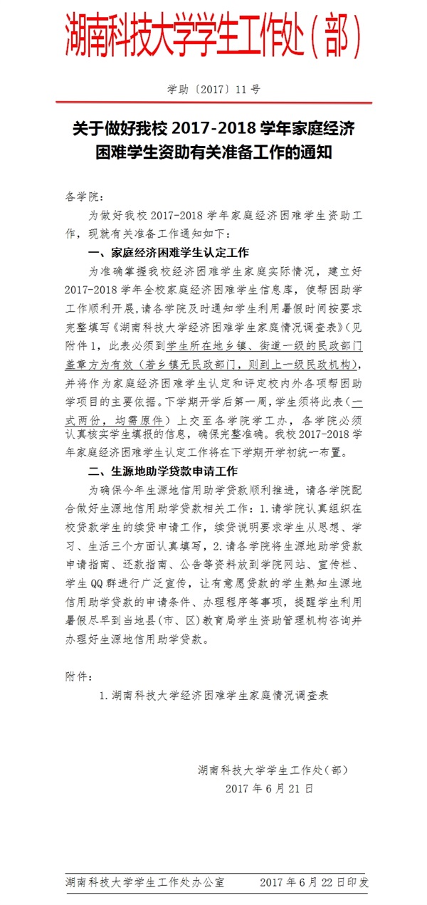 关于做好我校2017-2018学年家庭经济困难学生资助准备工作的通知